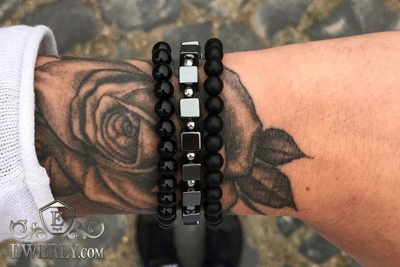В комплекте три браслета: два каменных из вулканической лавы и один из металла - стали.