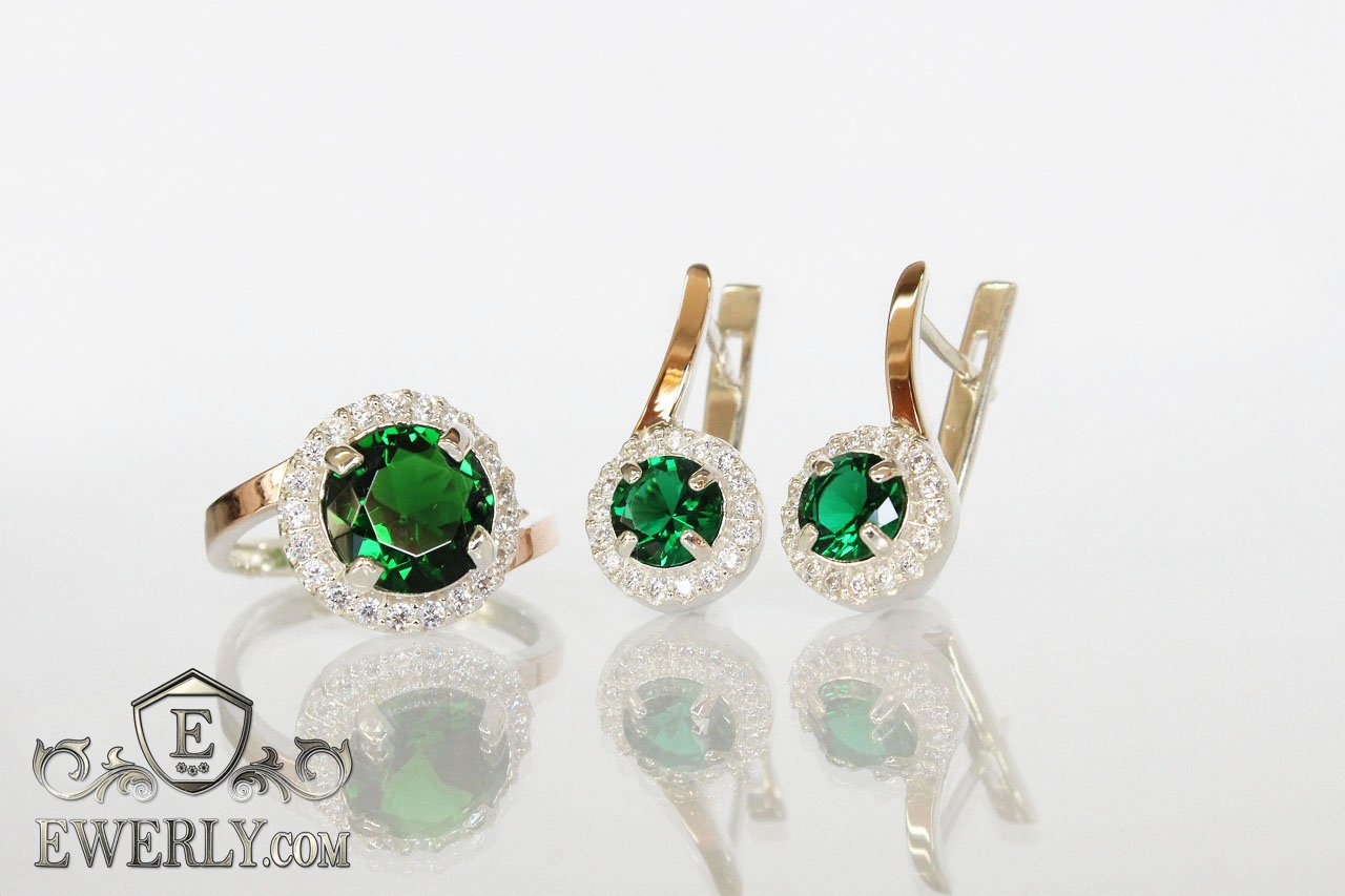 Жіночі срібні кільце і сережки з золотом і зеленими каменями